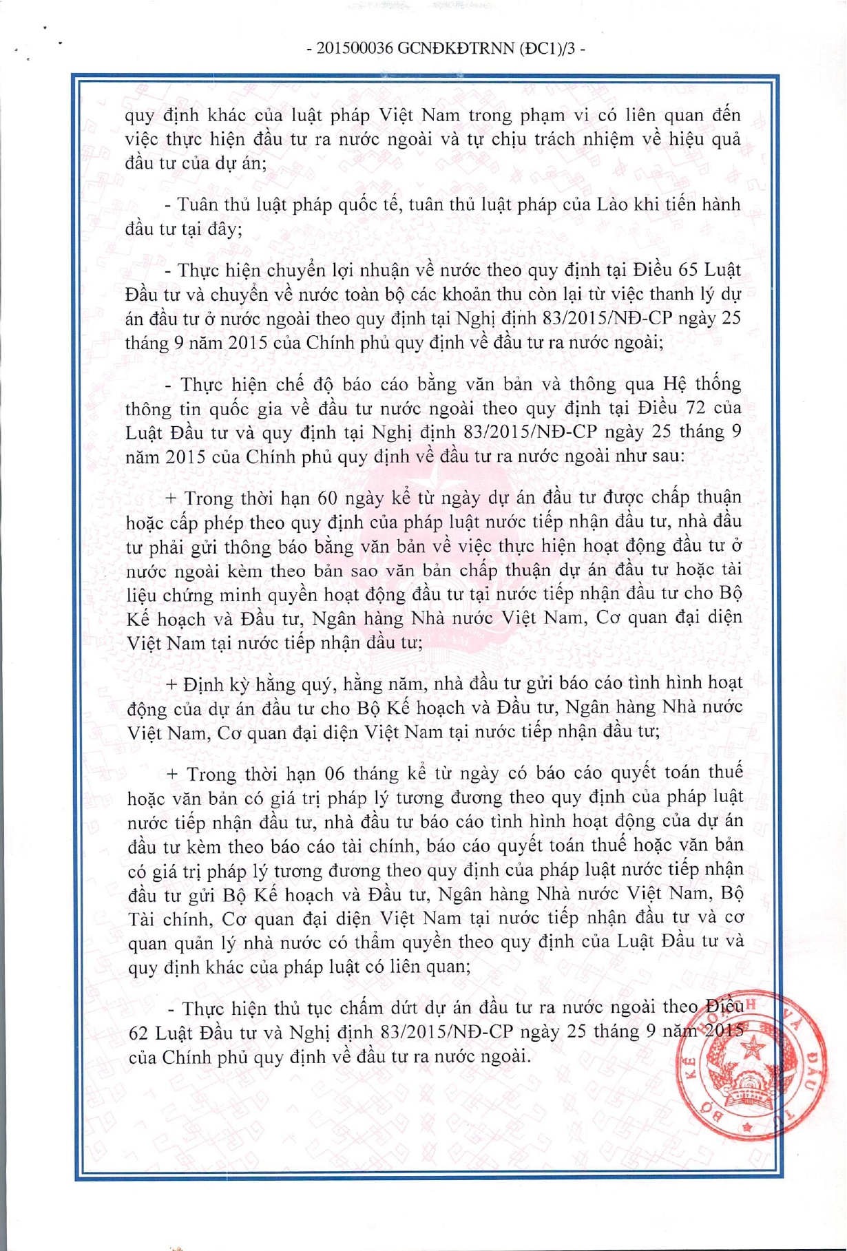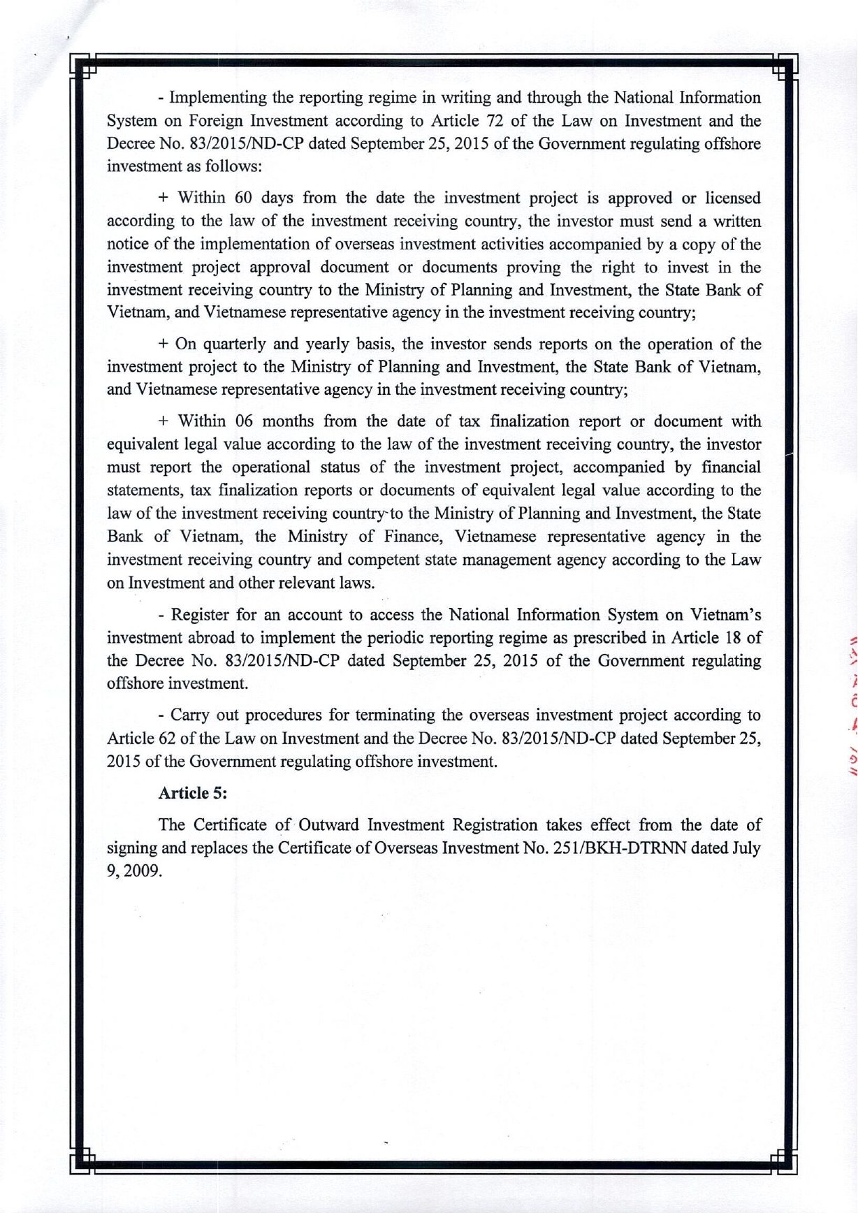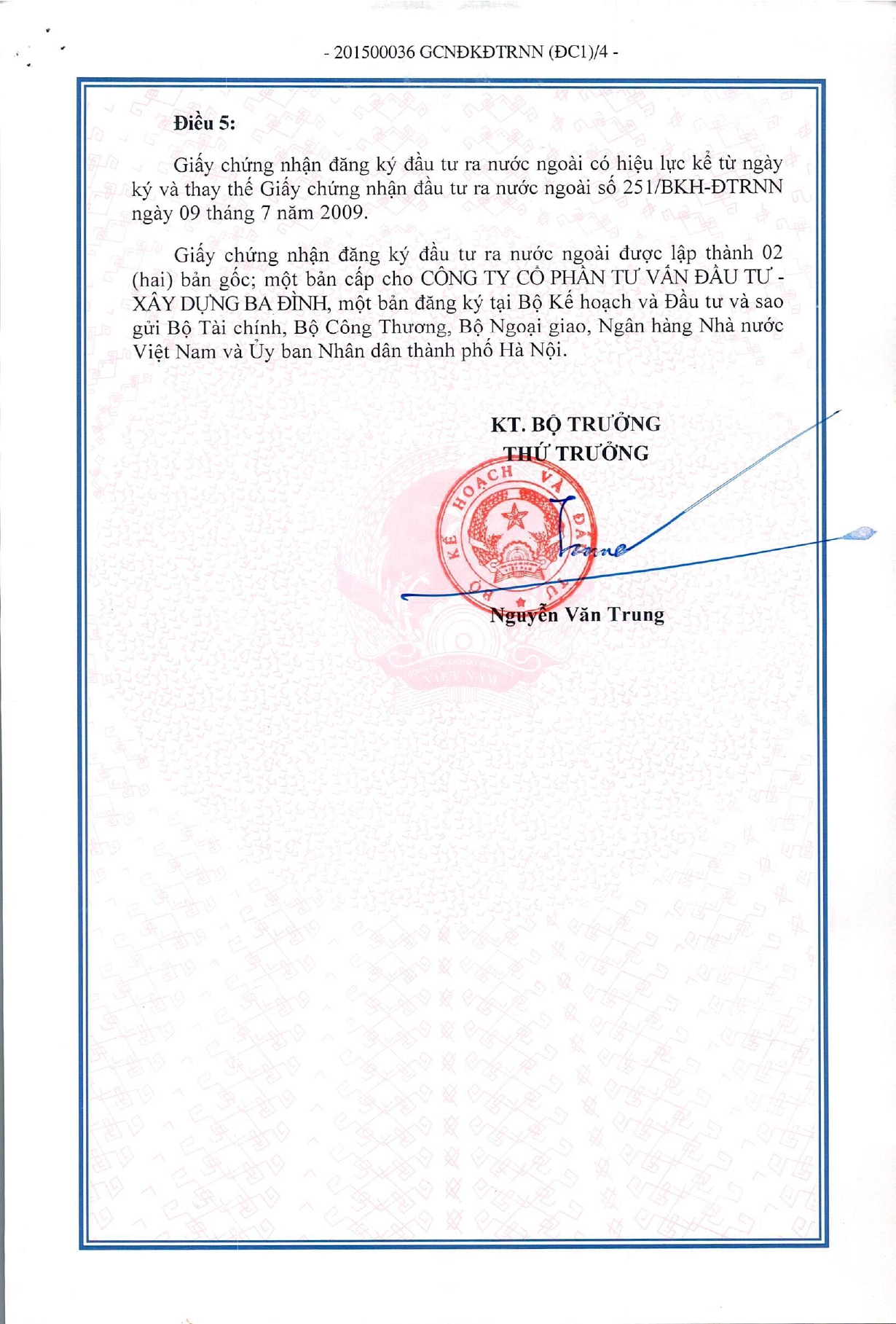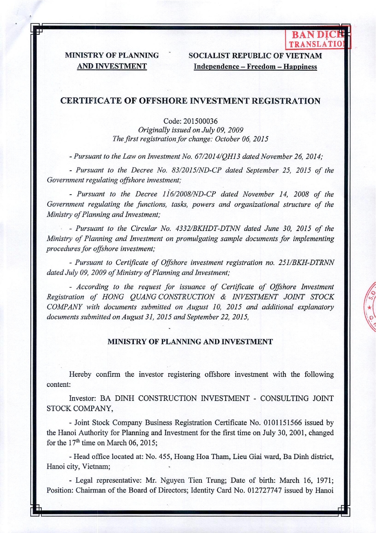 Giấy chứng nhận Đăng ký đầu tư ra nước ngoài số 201500036 của Bộ Kế hoạch và Đầu tư cấp ngày 09 tháng 07 năm 2009.