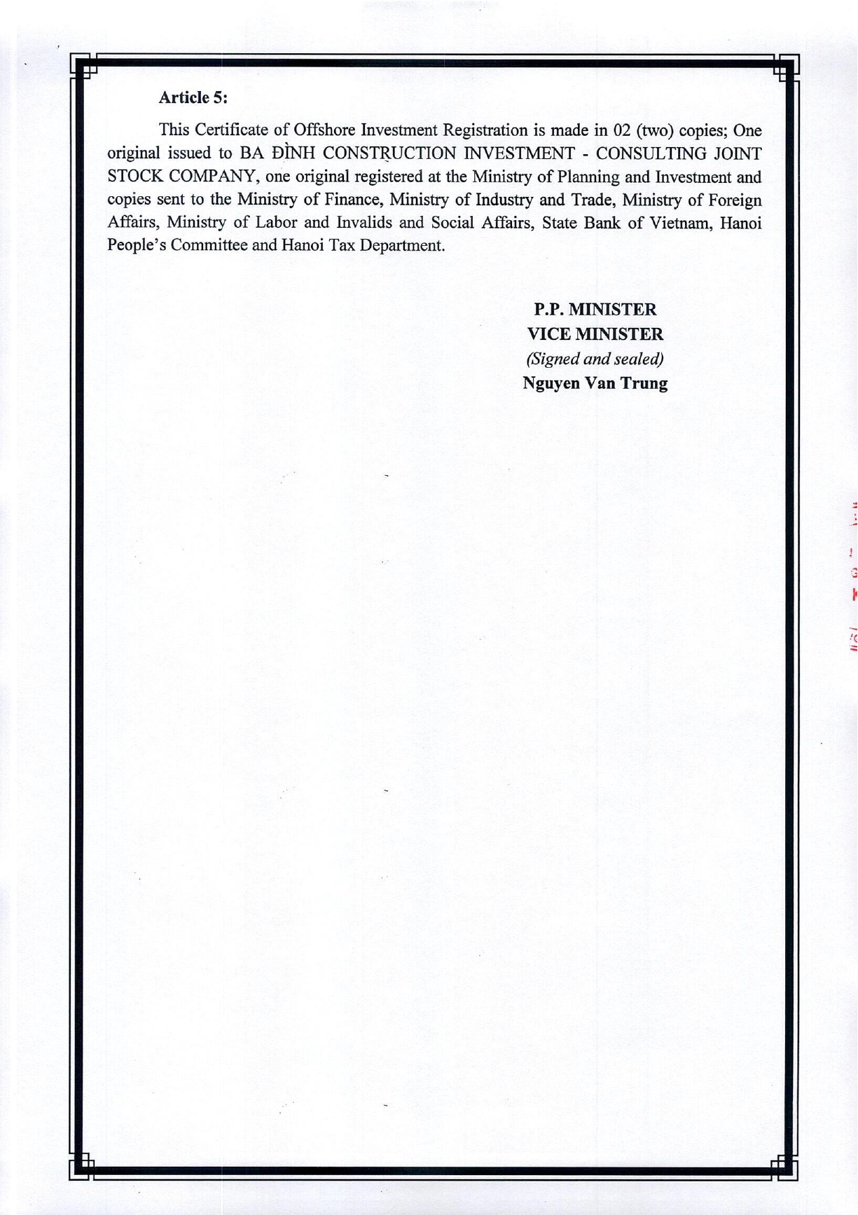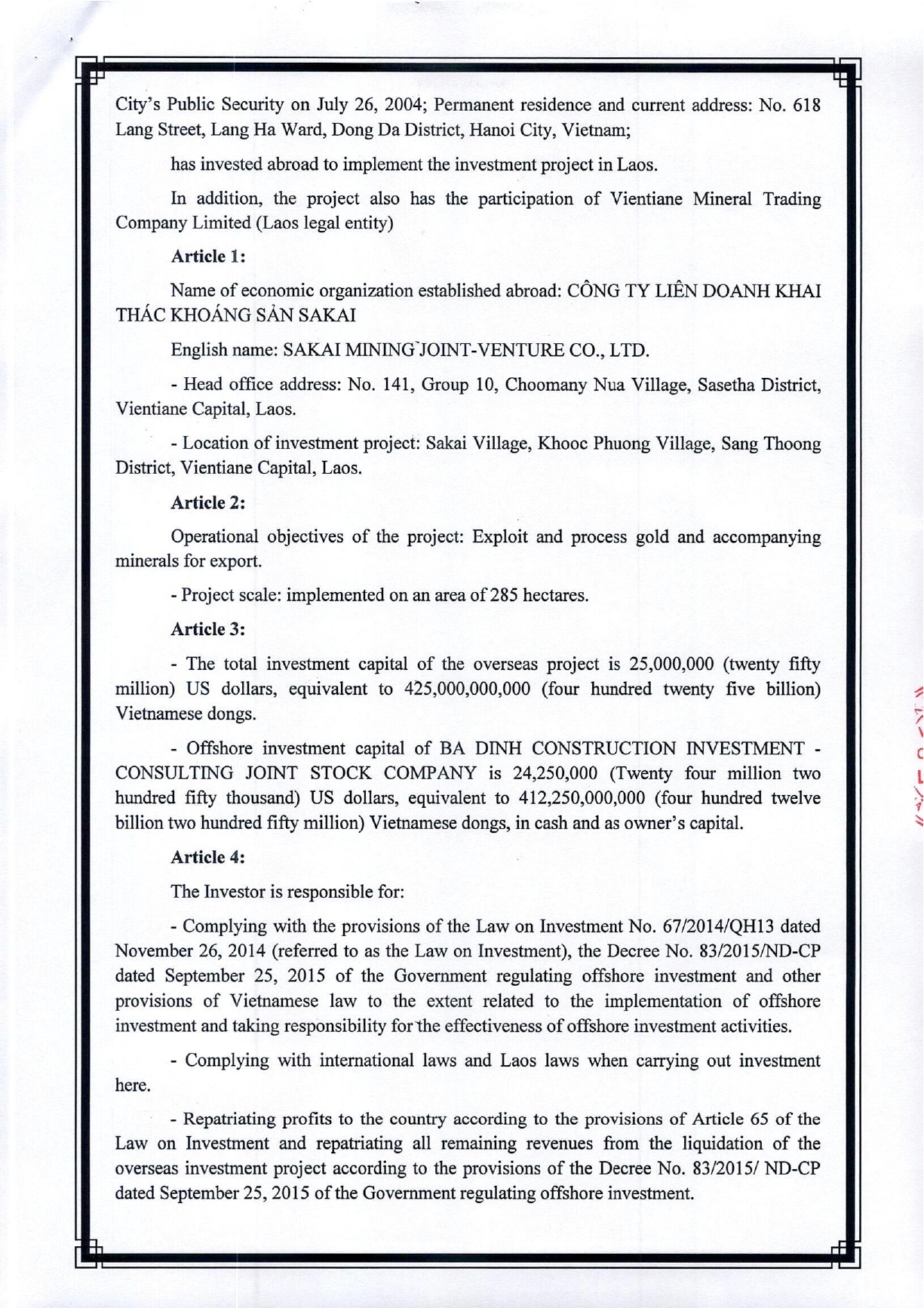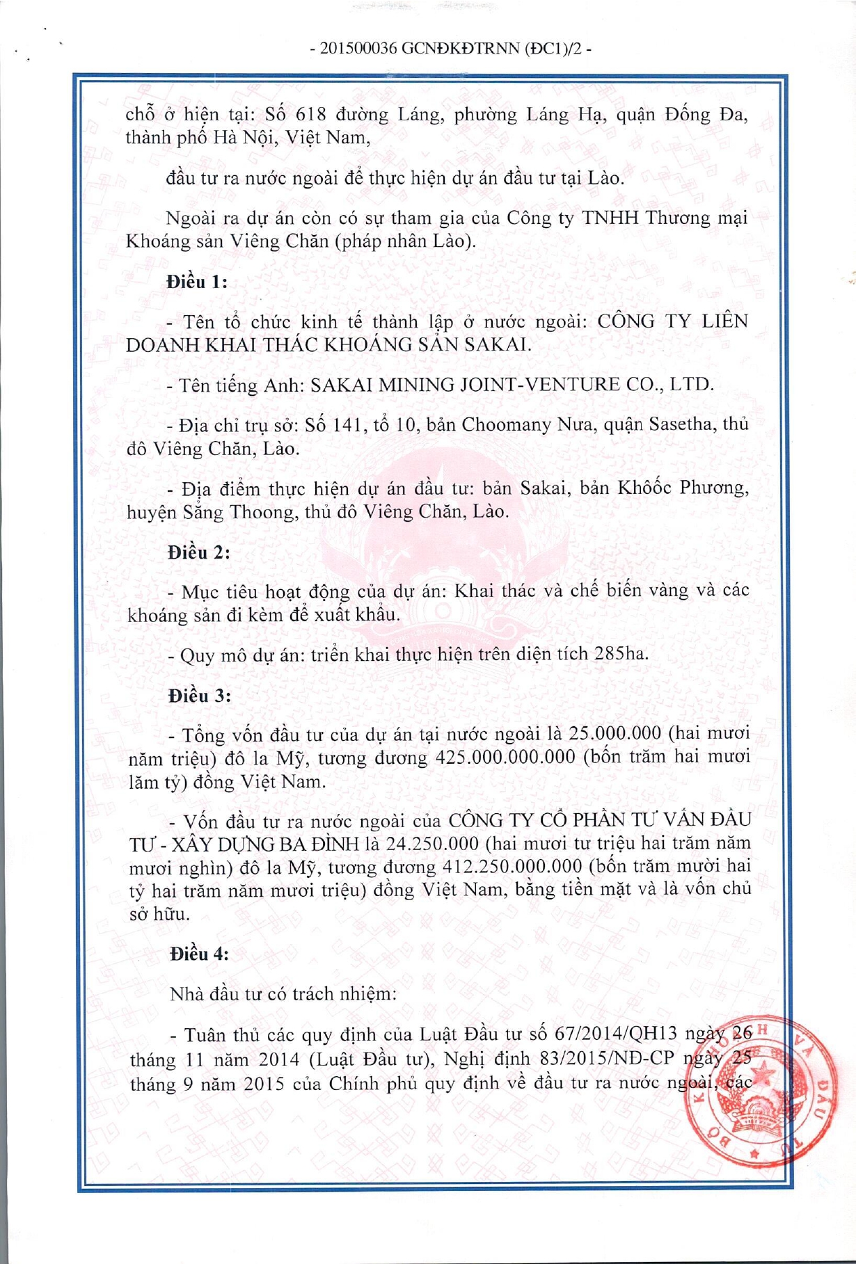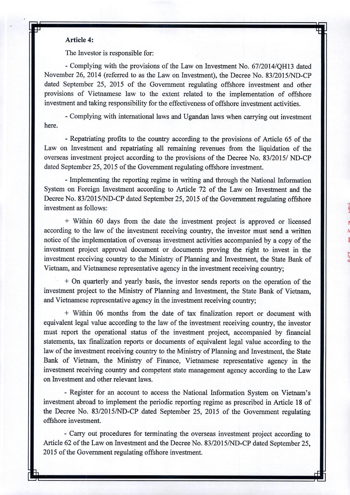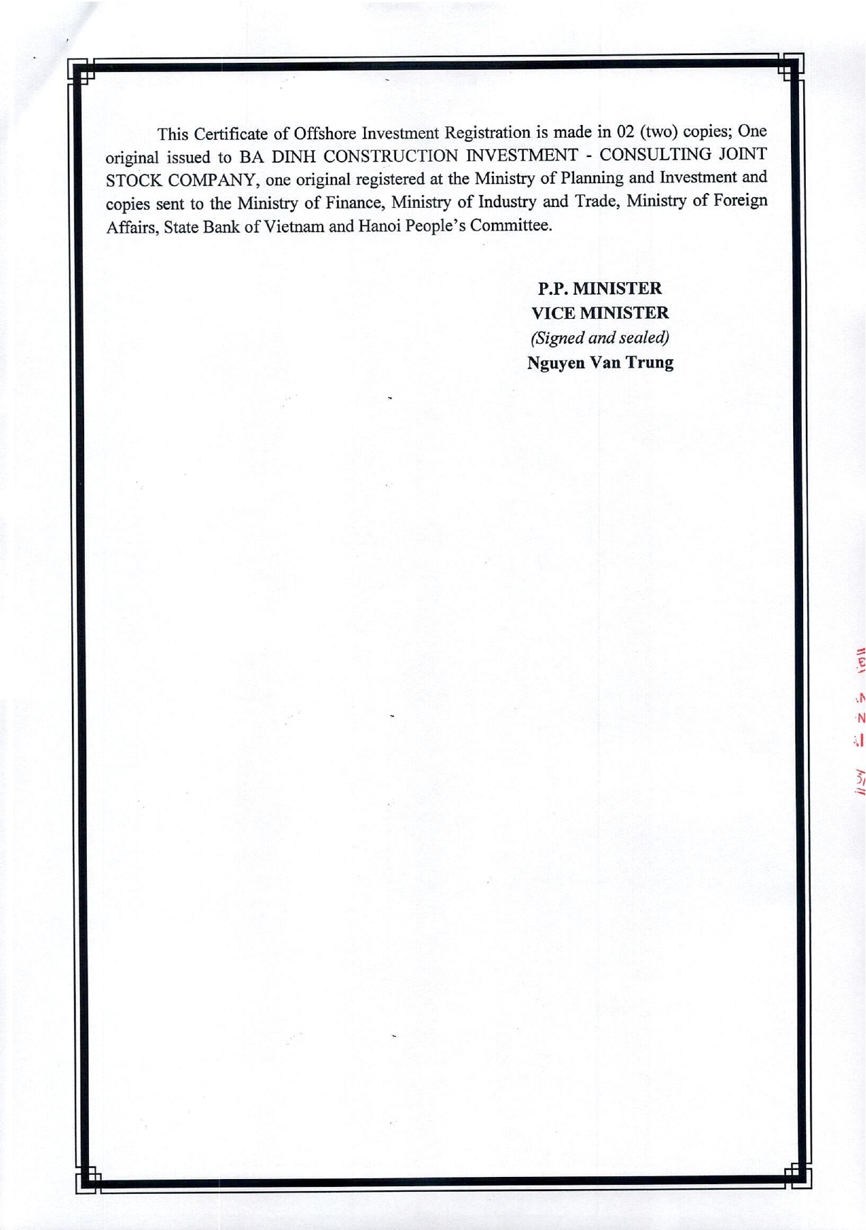 Giấy chứng nhận Đăng ký đầu tư ra nước ngoài số 201500036 của Bộ Kế hoạch và Đầu tư cấp ngày 09 tháng 07 năm 2009.