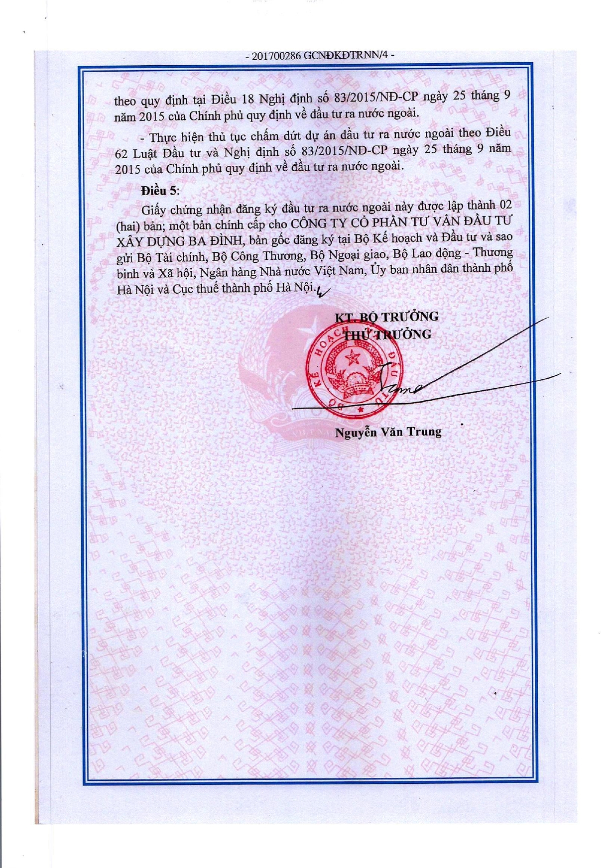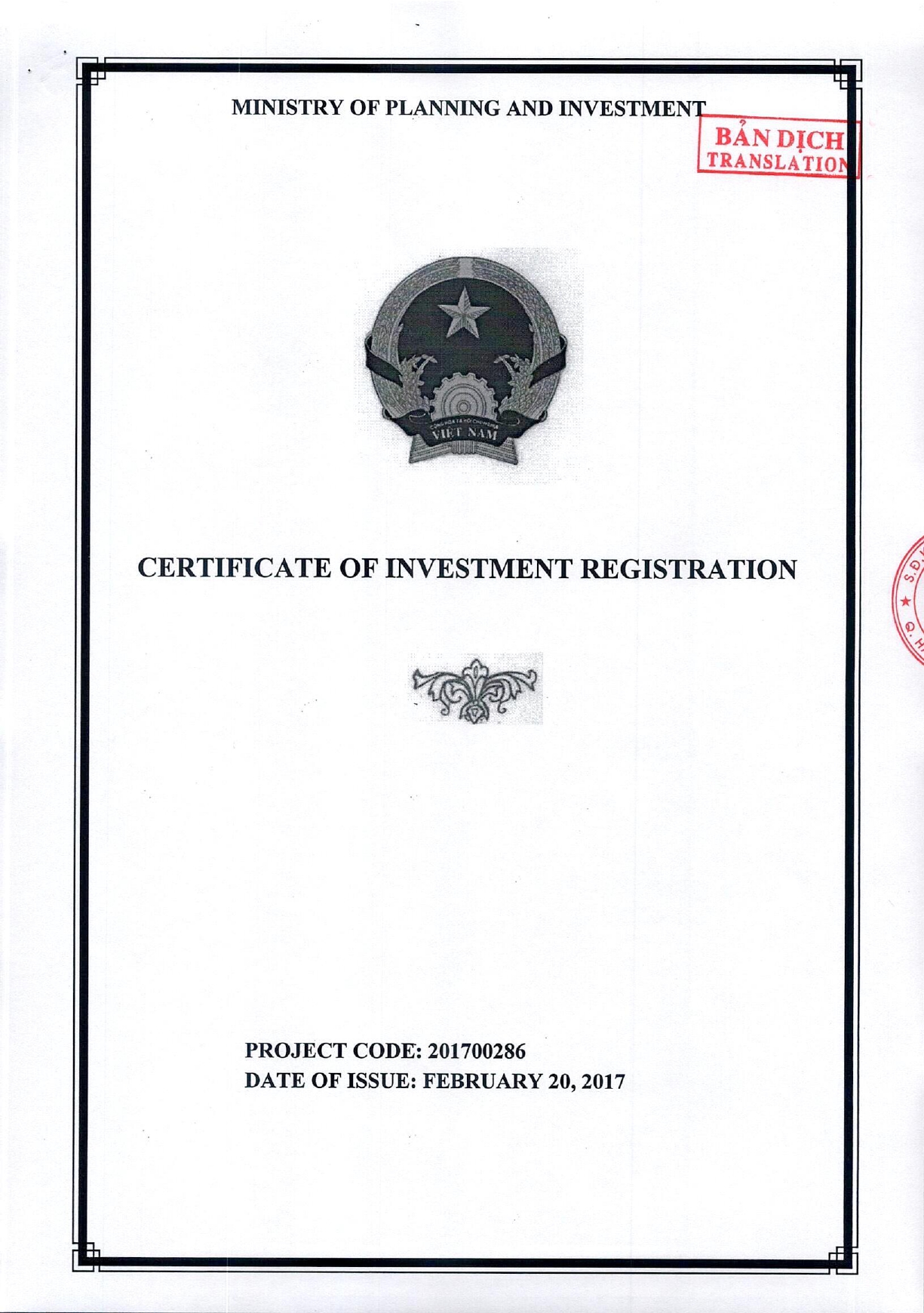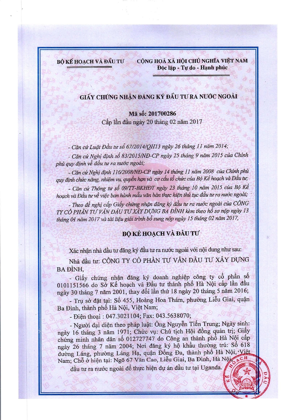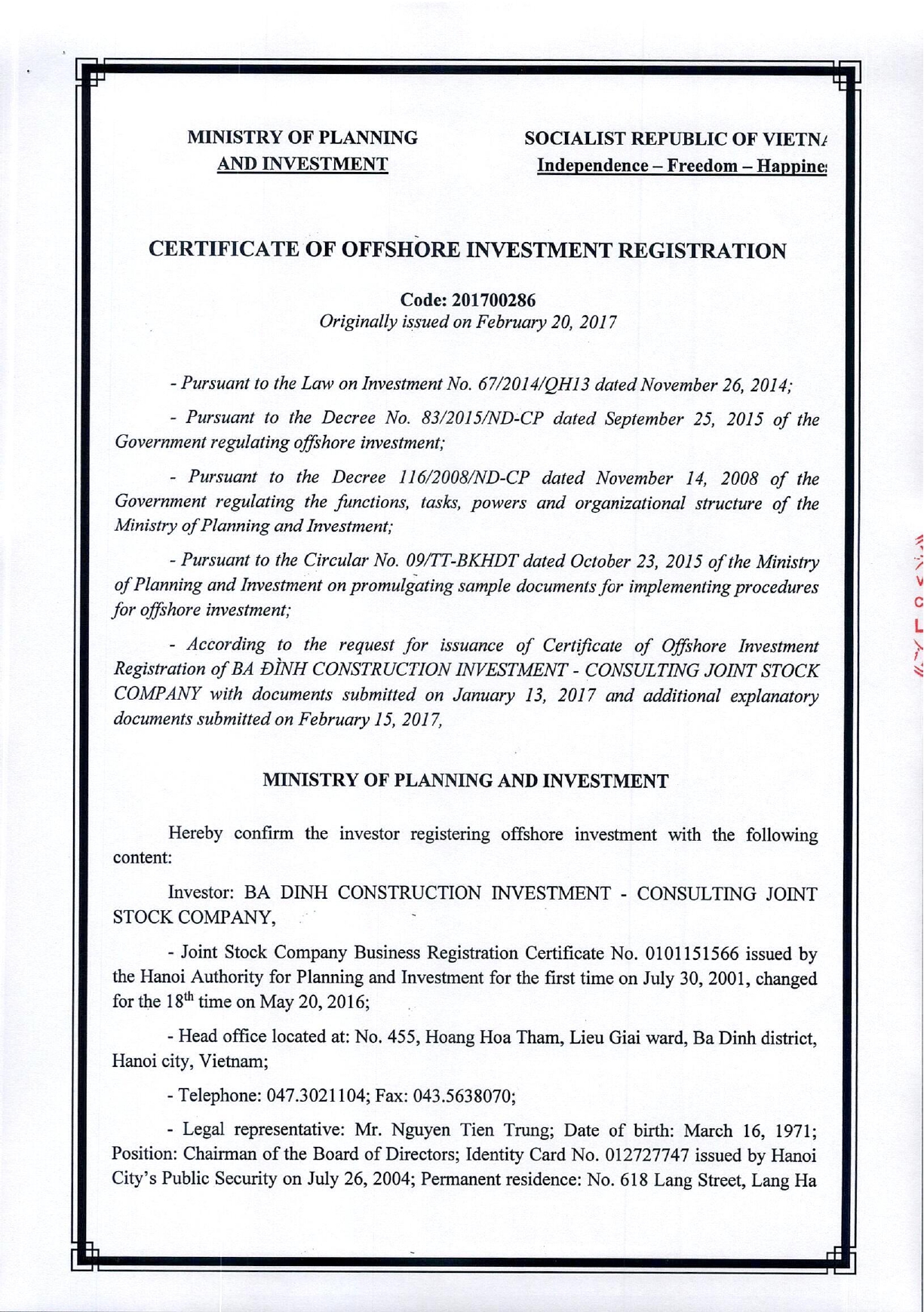 Giấy chứng nhân đăng ký đầu tư ra nước ngoài số 201700286 của Bộ Kế hoạch và Đầu tư cấp ngày 20 tháng 02 năm 2017.