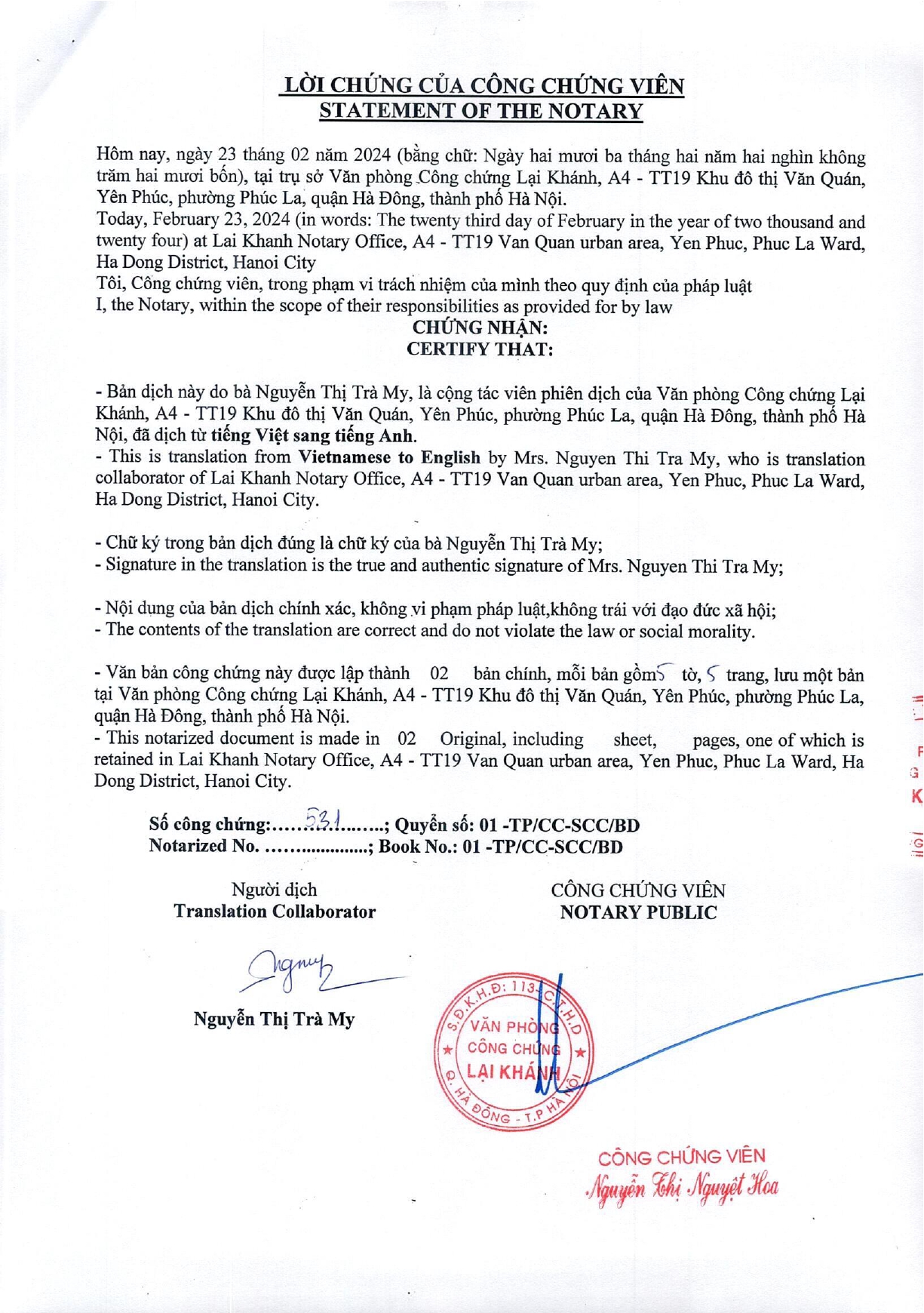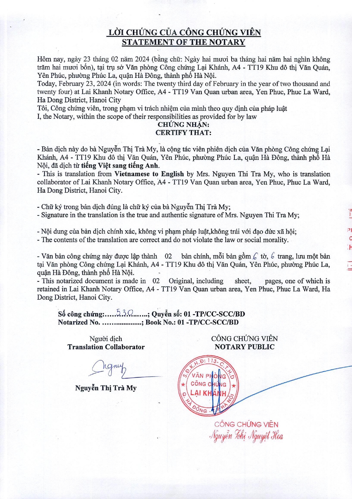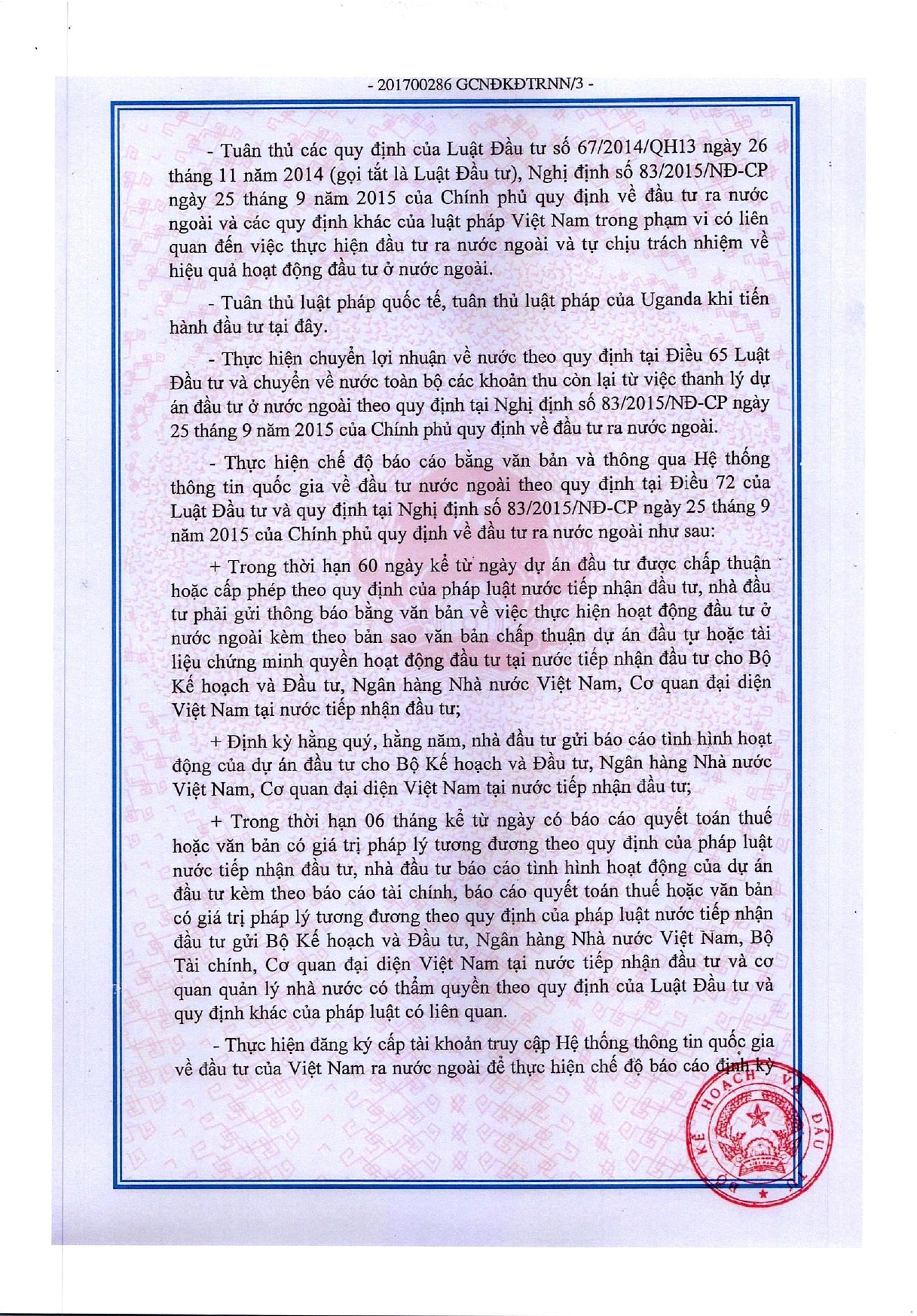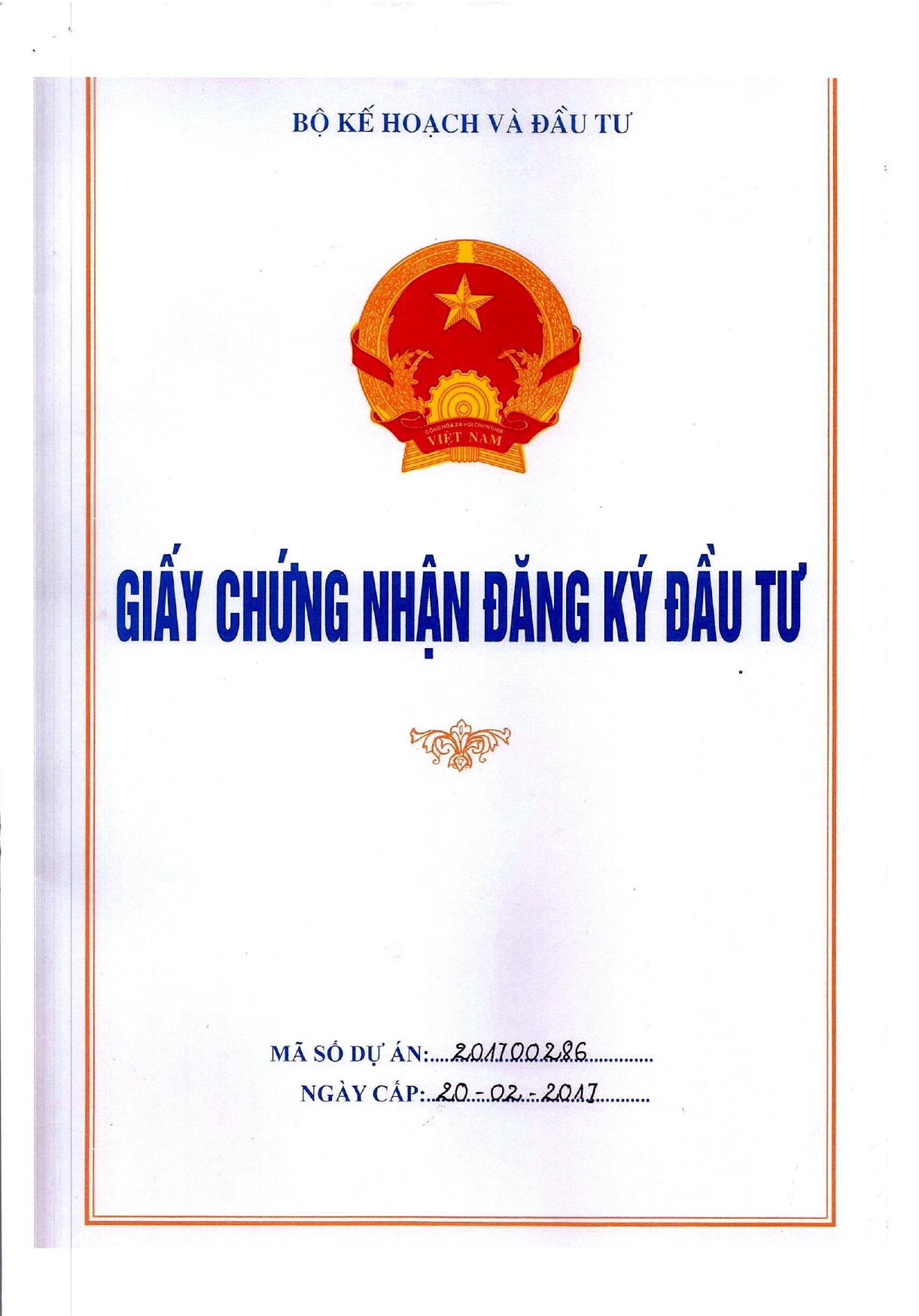 Giấy chứng nhân đăng ký đầu tư ra nước ngoài số 201700286 của Bộ Kế hoạch và Đầu tư cấp ngày 20 tháng 02 năm 2017.