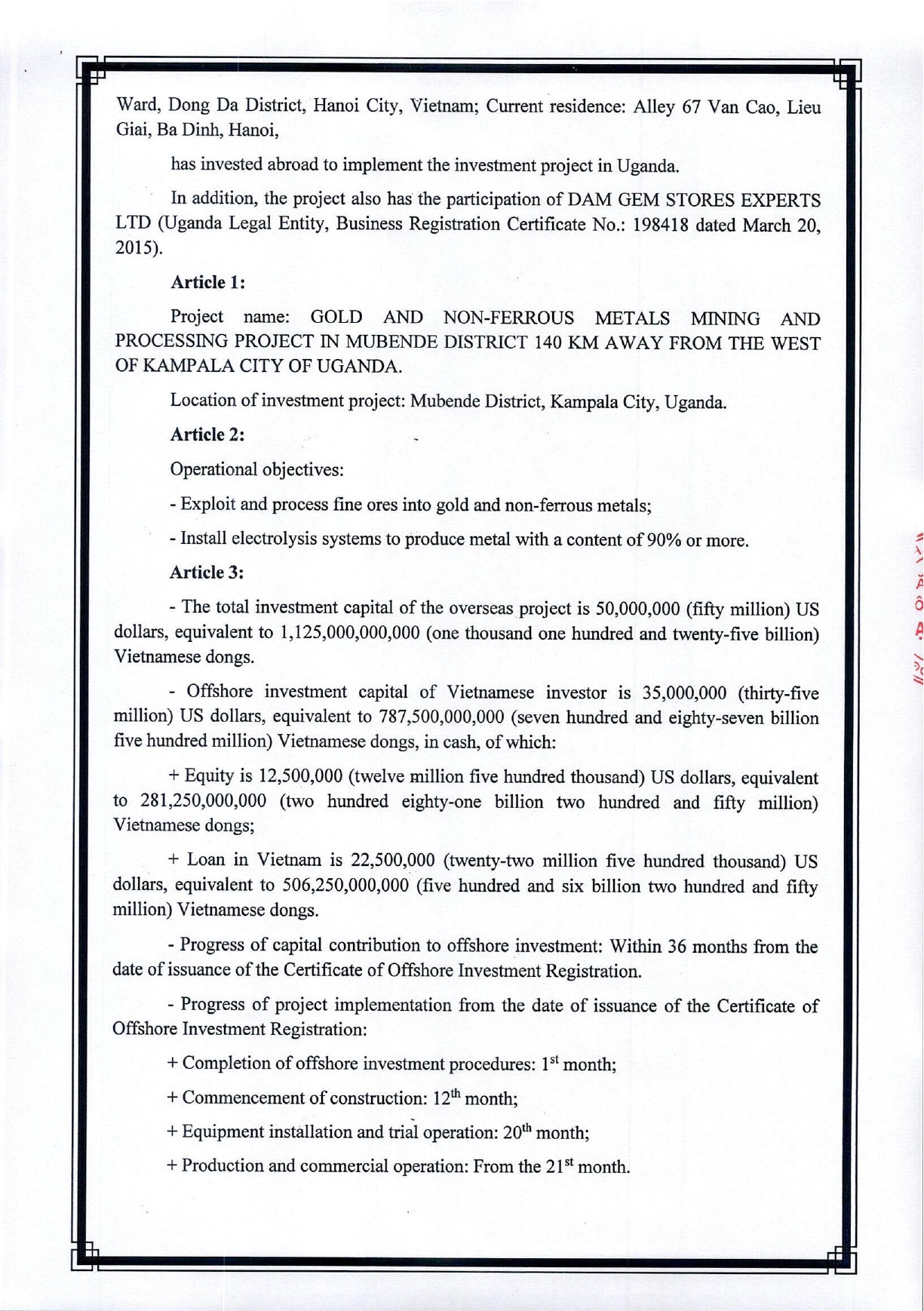2. Dự án: Khai thác, chế biến vàng và kim loại màu tại quận Mubende cách 140km về phía tây của Thành phố Kampala của Uganda